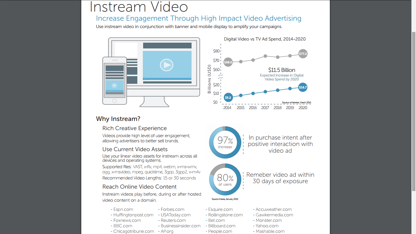 - Instream video advertising - video ads embedded within free online videos from social media sites and streaming services